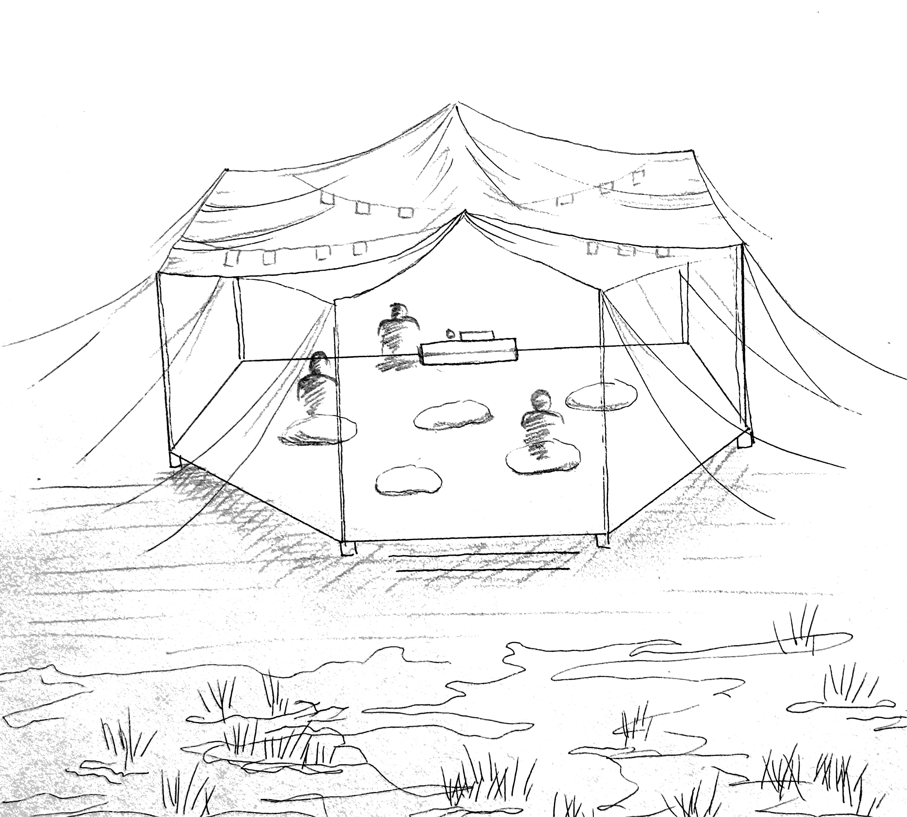 While the final form of the installation will evolve on site, its construction will follow consistent principles of lightness, modularity, and care. Built from lightweight, modular materials—natural textiles and fabric, paper or vellum-like surfaces, reclaimed or untreated wood, cord or rope, and select secondhand furniture—the installation is assembled without permanent fixings, adhesives, or ground alteration. All elements remain freestanding and reversible.